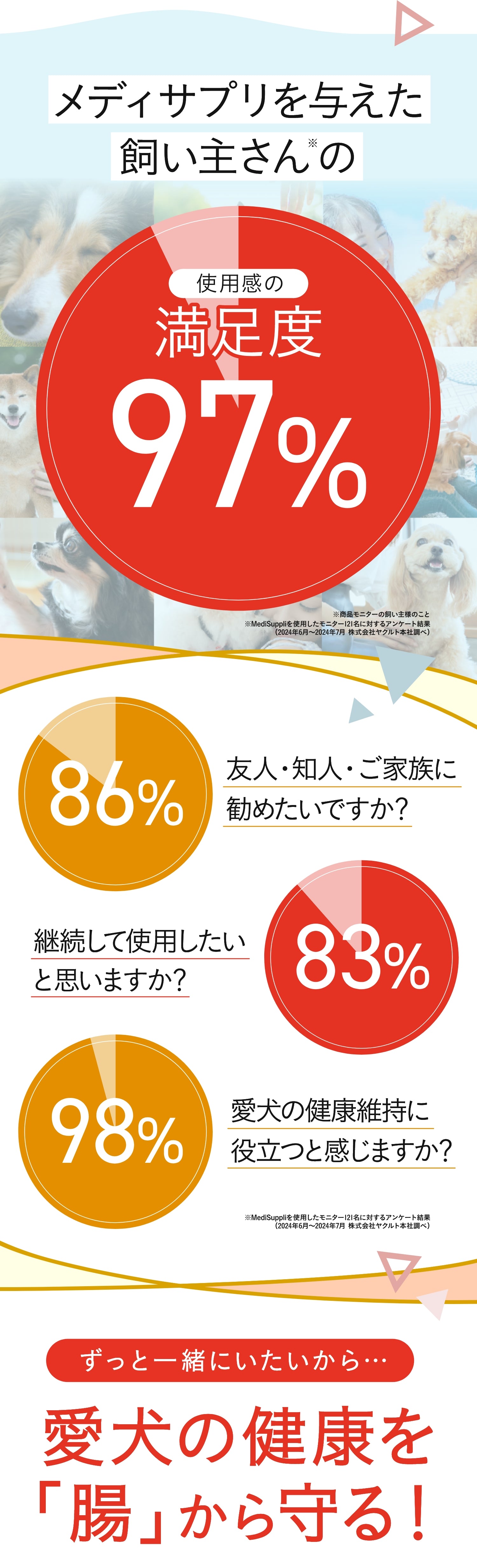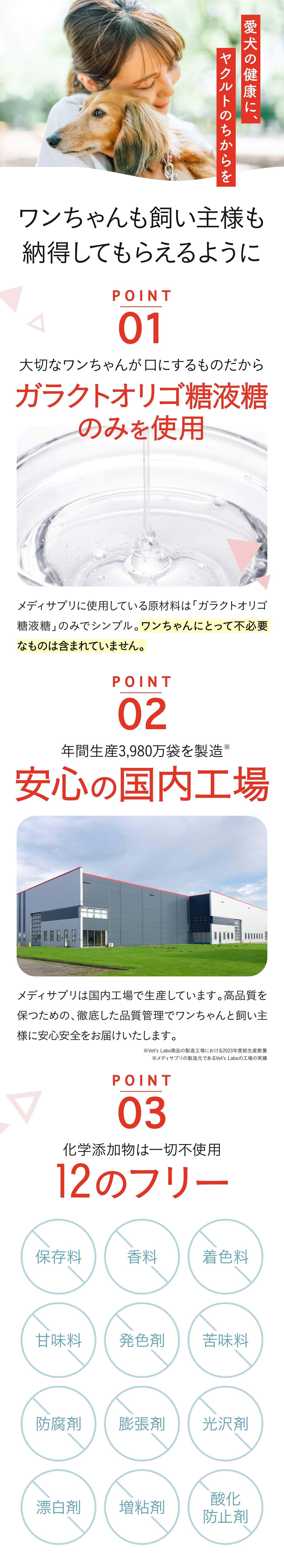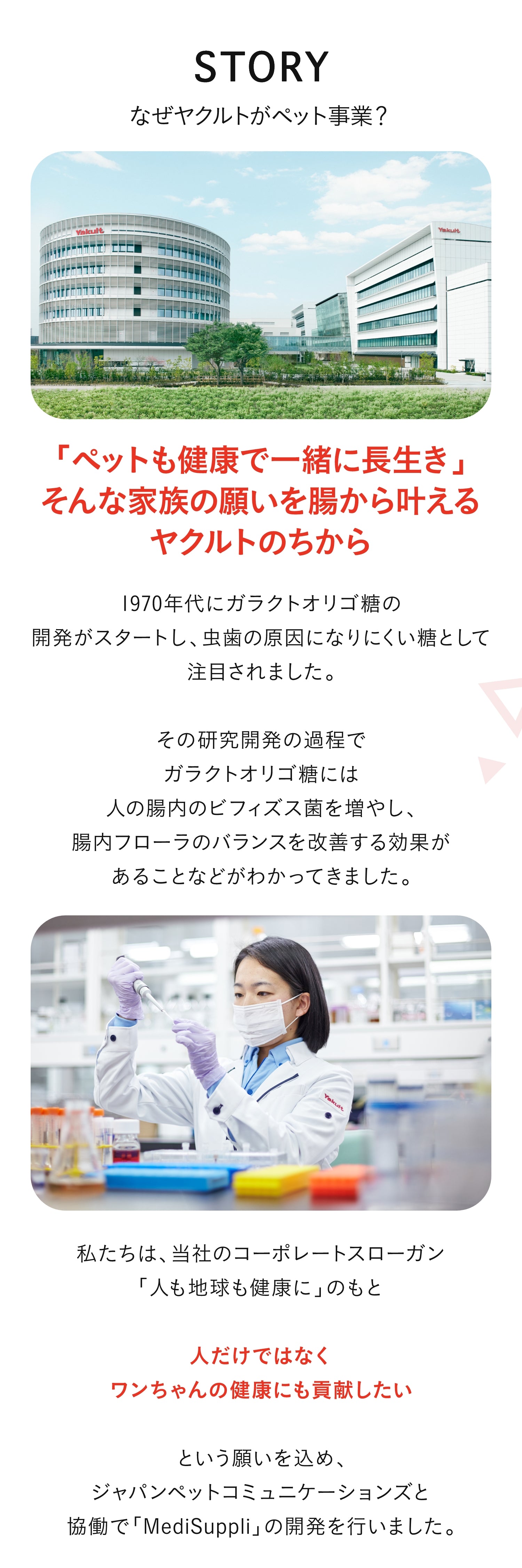 川崎獣医師会にもご協力いただき、ヤクルト独自の「ガラクトオリゴ糖」にはワンちゃんの腸内菌叢や口腔内環境を整えるチカラがあることがわかりました。
